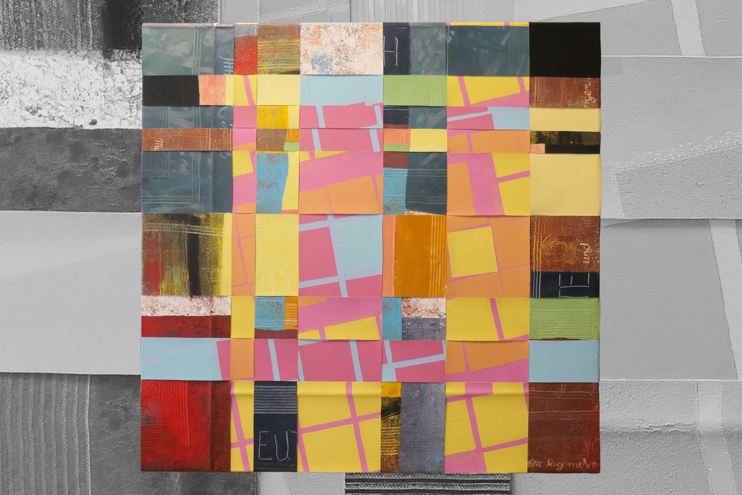 Titel: "Orientierungslos im Koordinatensystem" 2025 Fertigstellung: 2025 Verwendete Materialien: Ölfarben auf Leinwand Technik: Mischtechnik, Montage Format: B x H x T = 80 x 80 x 2 cm